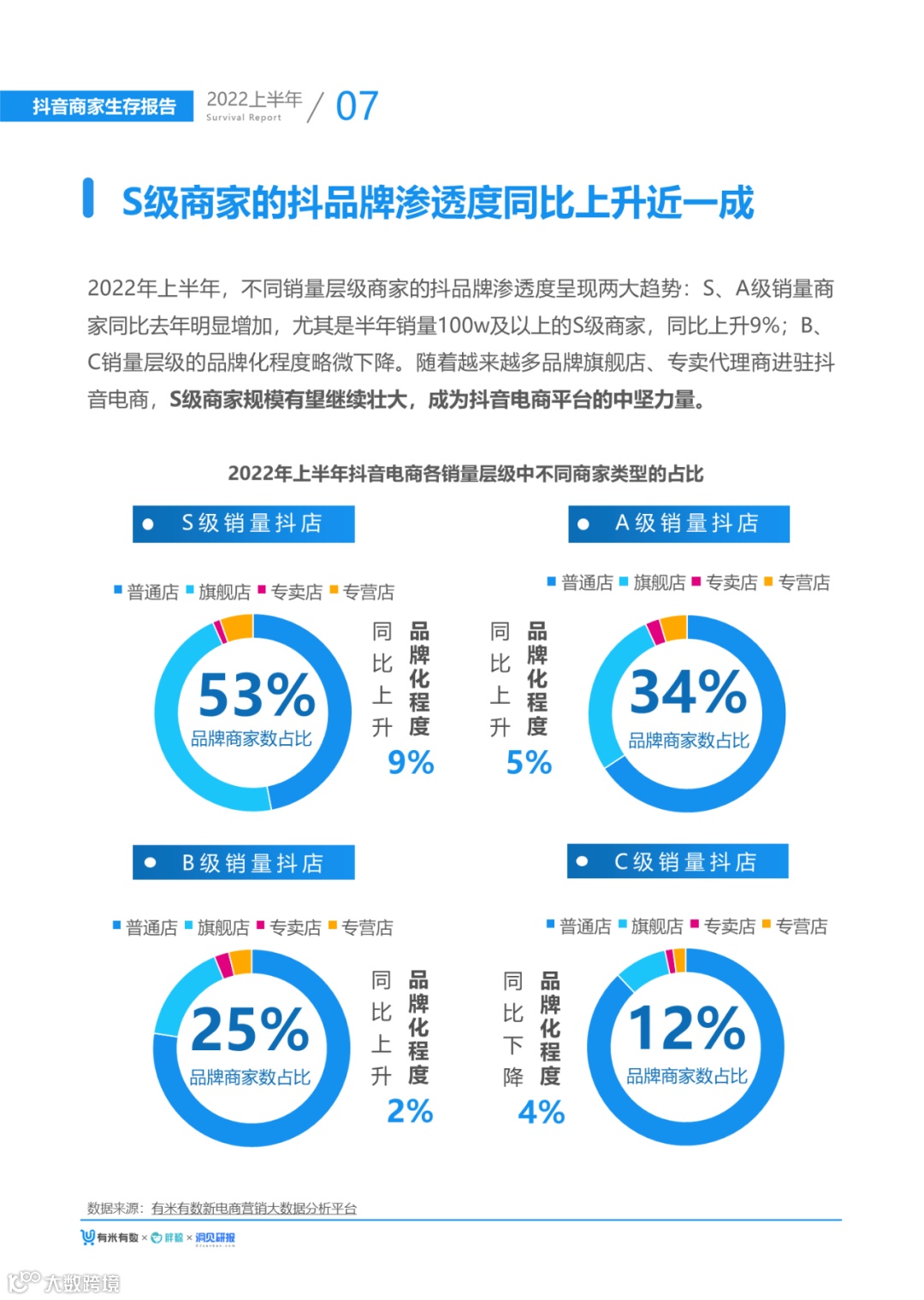 从两种维度对抖音店铺作分层:一是基于上半年销量将店铺分为S级(销量>=100w)、A级(销量10-100w)、B级(销量1-10w)、C级(销量0-1w);二是将旗舰店、专卖店、专营店三种有品牌授权的抖音店铺统称为“抖品牌店铺”,以观察不同行业及销量层级商家的抖品牌发展状况。