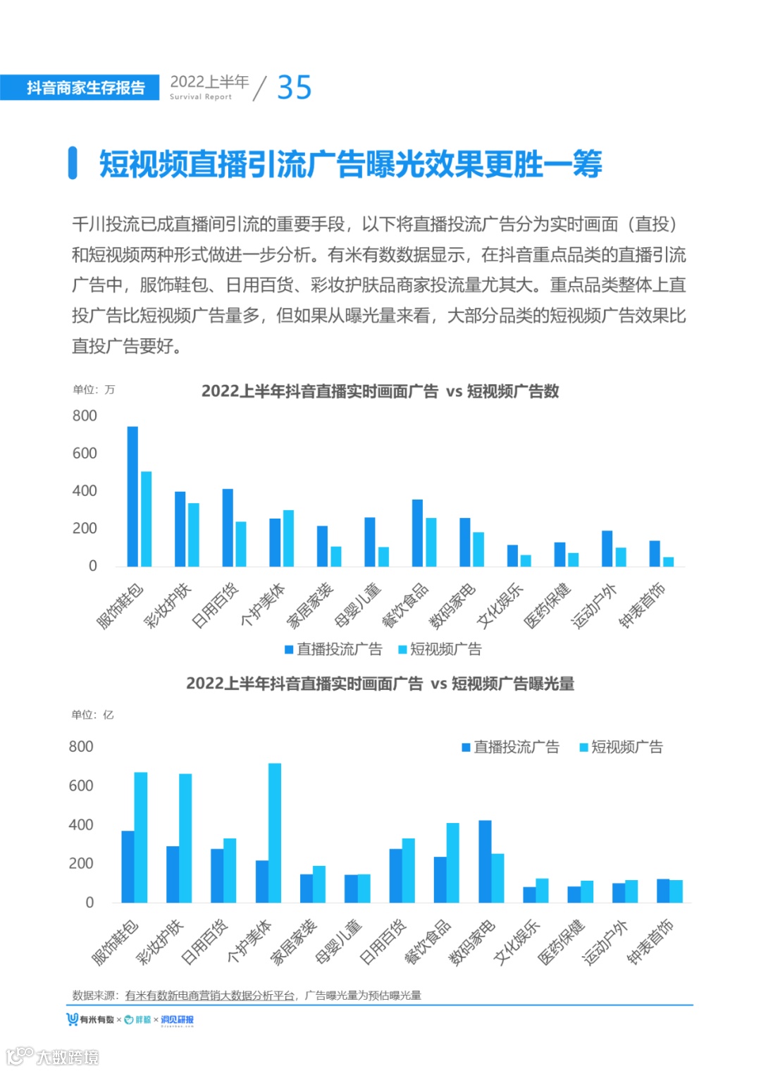 千川投流已成直播间引流的重要手段,服饰鞋包、日用百货、彩妆护肤商家投流量尤其大。直播投流广告分为实时画面(直投)和短视频两种,直投广告比短视频广告量大,但大部分品类的短视频广告效果比直投广告要好。重点品类直播投流视频的时长集中在