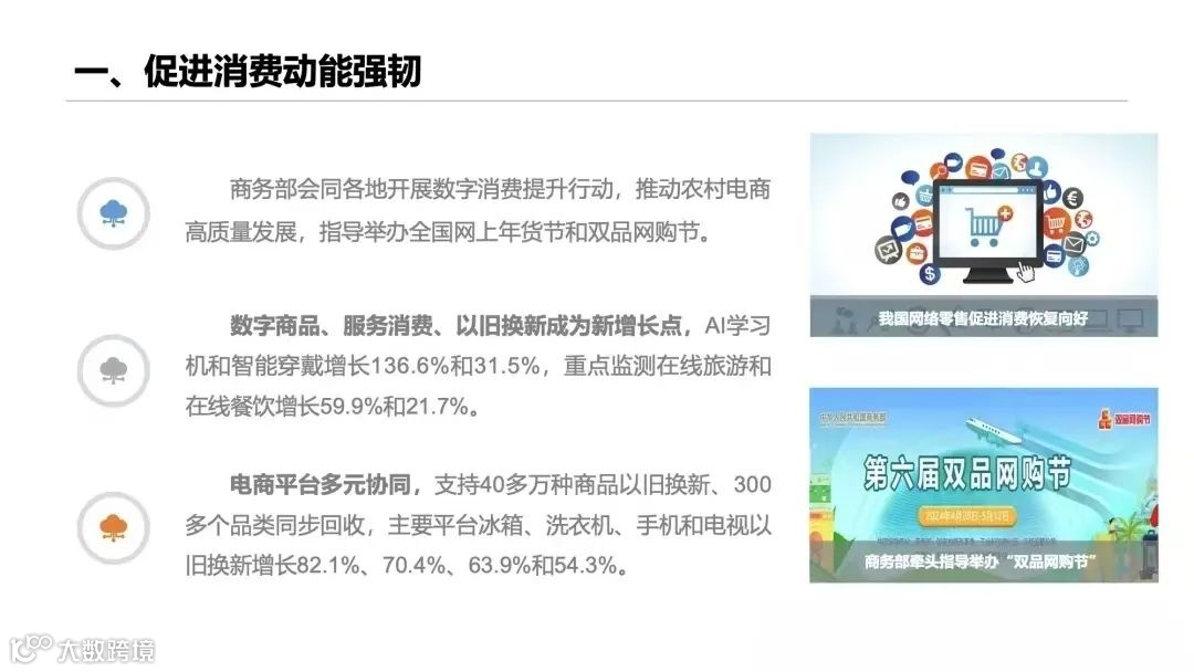 2024年上半年,我国电子商务领域迎来了新的发展机遇。通过一系列创新举措,如数字消费提升行动和农村电商的高质量发展,我国电子商务不仅促进了消费动能的恢复,还开辟了新的增长点。