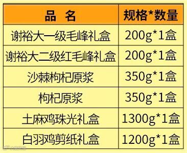 白藜麦200g*5 三色藜麦500g*5 纳姆果园特优枸杞250g*4 沙棘枸杞原浆350g*2 枸杞原浆350g*2 |