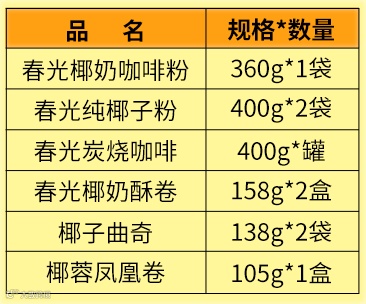 | 套餐四:椰香海南 | 套餐五:春光十全食美春字礼盒 | 套餐六:休闲小刻 |