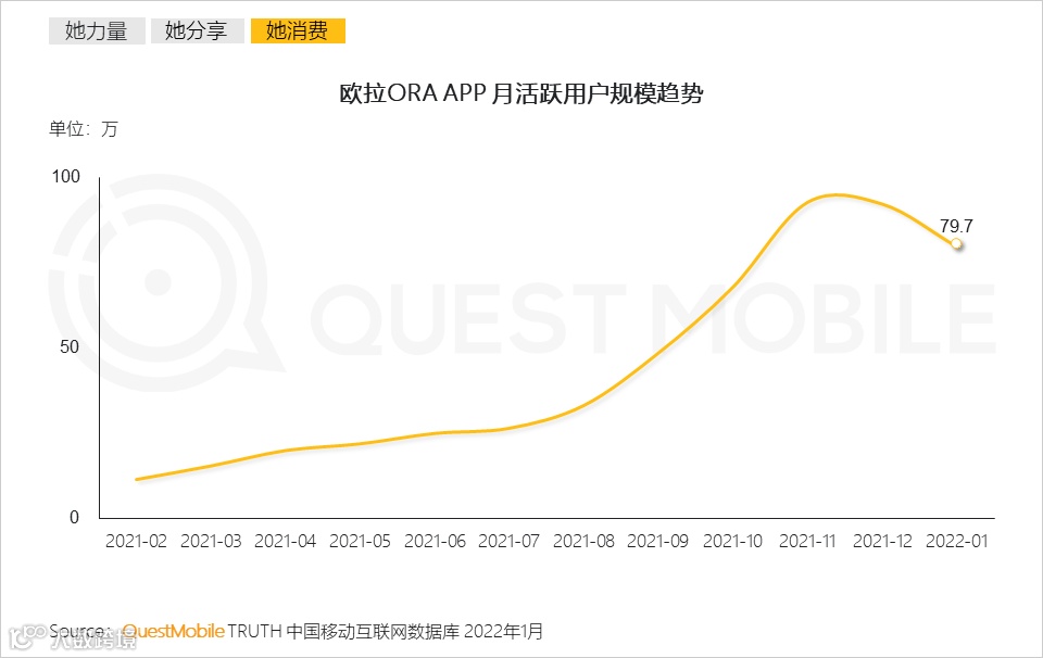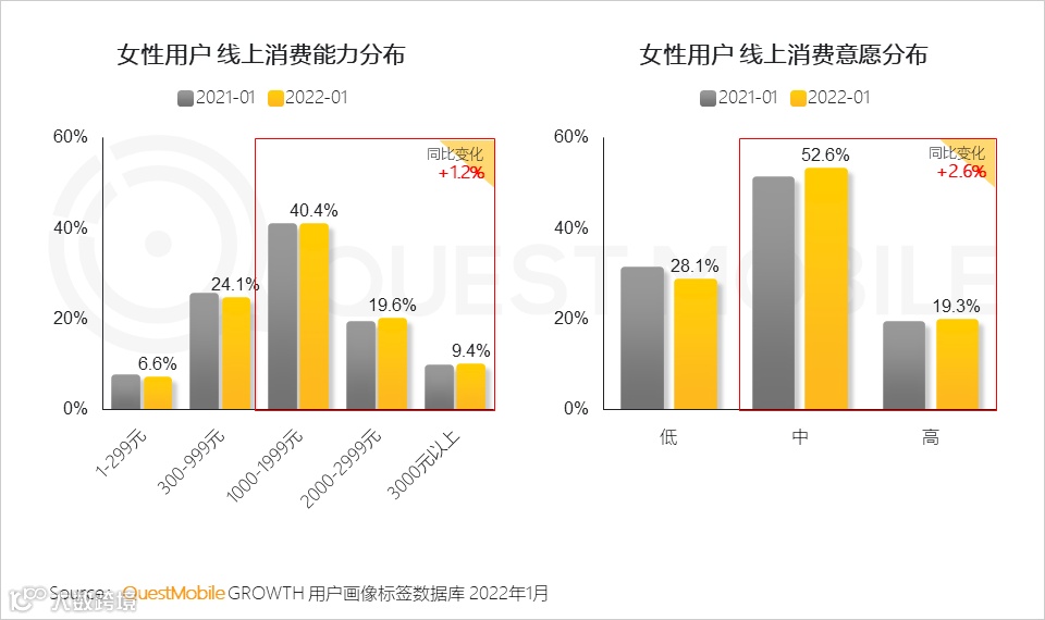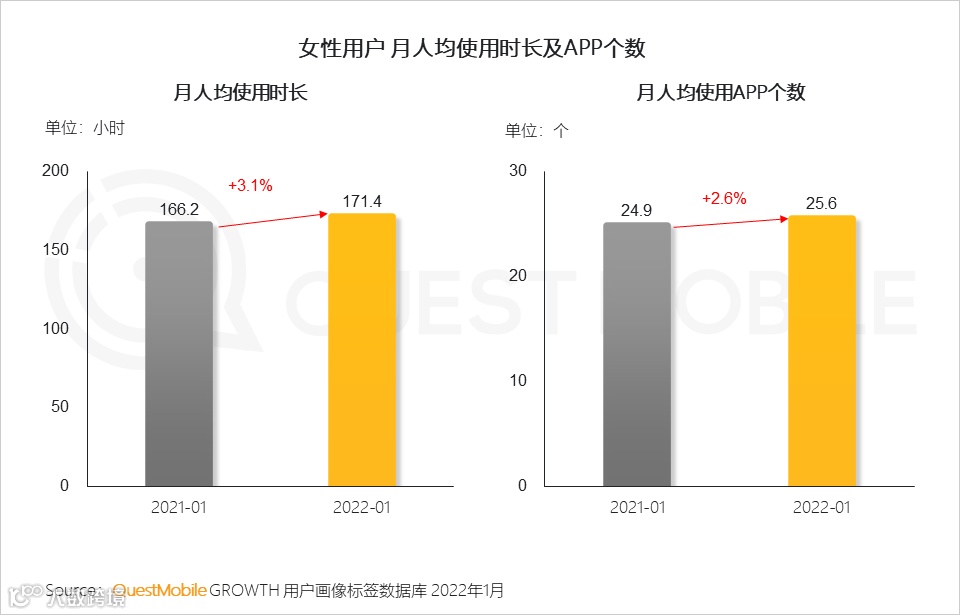 数据显示,2022年1月,女性用户月人均使用时长突破170小时,APP使用个数达25.6个,分别提升3.1%、2.6%。
