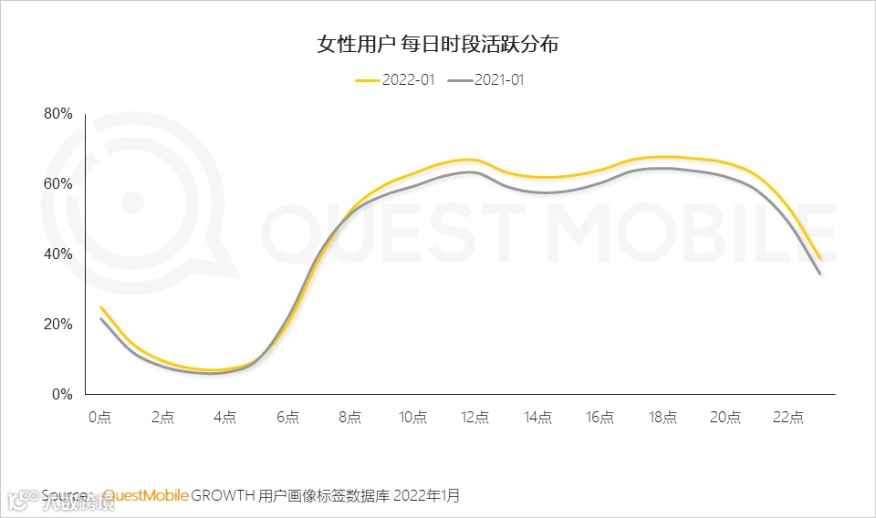 4、用户互联网使用程度加深趋势下,女性用户每天时段活跃较去年同期整体大幅提升
