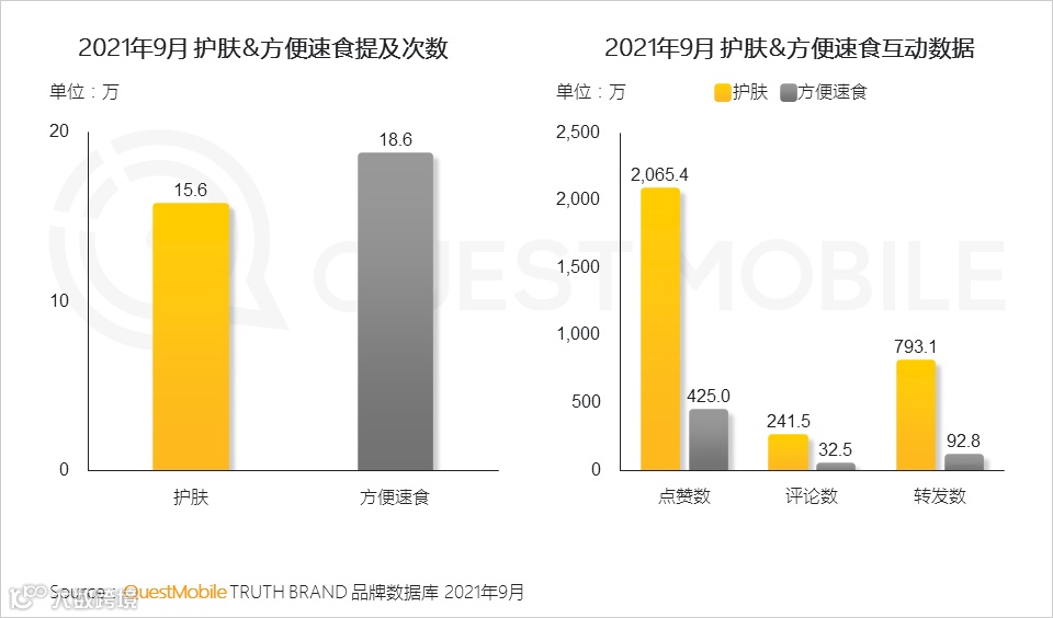 4、护肤品牌营销力度更大,提及次数虽不及方便速食品牌,但互动效果更佳;方便速食品牌普遍具有广泛知名度,品牌内容中大部分为用户自发上传