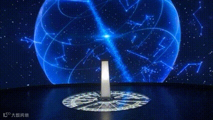 展项《时间机器》是由一个日晷装置、底纹符号、和一段关于时光穿梭的沉浸式影像组成。整体视觉以中国观星图中的“圆”为基础,触发装置由中国古代时钟日晷的图案制成的千层镜以及触发柱组成,地面布满古代星象符号,以及西东北南四个神兽坐镇:左青龙、右白虎,上朱雀、下玄武。数字影像由星座符号到中国的传统文化符号的变化和演绎串联起来,所有符号在圆形结构中流动闪烁,营造一种东方美学与科幻美学的冲突与融合的美。