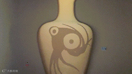 《陶纹穿越》使用3DMapping技术将马家窑时期的螺旋纹图案经过趣味性演变成米诺斯时期的章鱼纹样,使得中西方文明巧妙地融合贯通。陶纹还可以跃上观众的脸庞上,《人面陶纹》构思来源于史前的“涂面文化”,展项将东西方祭祀文化巧妙结合并在拍照场景中再现,让观众用身体的一部分作为媒介,“身临其境”地体验史前文明狂野、粗放的表达与神秘符号的魅力。