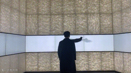 《纸上乾坤》运用数字交互影像模拟毛笔落墨于纸的动态视觉。观众可以自由地通过肢体动作,实时在长卷式屏幕上绘出水墨线条,沉浸式感受宣纸承载的中国水墨韵味和纸这一创作载体的艺术表现力。