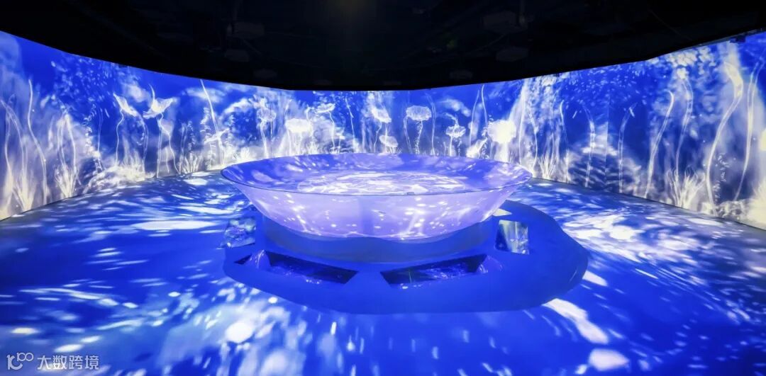 「纹」以载道“流光溢彩”展区中的海水龙纹,选自景德镇窑青花海水白龙纹八方梅瓶。龙腾四海,寓意风调雨顺、四海升平。随着我们的脚步,可以看到海浪起伏,浪花朵朵。海水纹与龙纹的巧妙结合,是自然力量与神圣象征的完美交融,在这个数字化的展示空间里,让观众沉浸式领略到中式纹样的独特魅力。