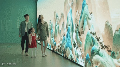 正处于爱玩爱笑年纪的孩子,很难静下心来领略文化魅力,隔着玻璃欣赏中国画的传统文物游览体验在他们眼中似乎有些单调枯燥。而在苏州湾数字艺术馆(EDCC)的特展“画游千里江山——故宫沉浸艺术展”,青绿山水画中的顶尖国宝《千里江山图》变成了流动的光影盛宴。