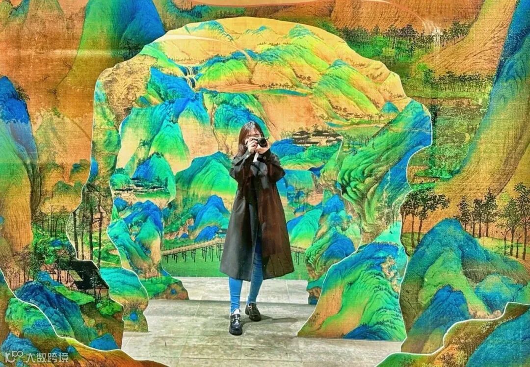 橱窗内层层叠叠的千里江山,既有着幻梦般的轻盈,又带着浩瀚山河的厚重,使得“这幅画”更跌宕起伏,富有强烈的韵律感,让人忍不住想走进去,成为艺术的一部分。