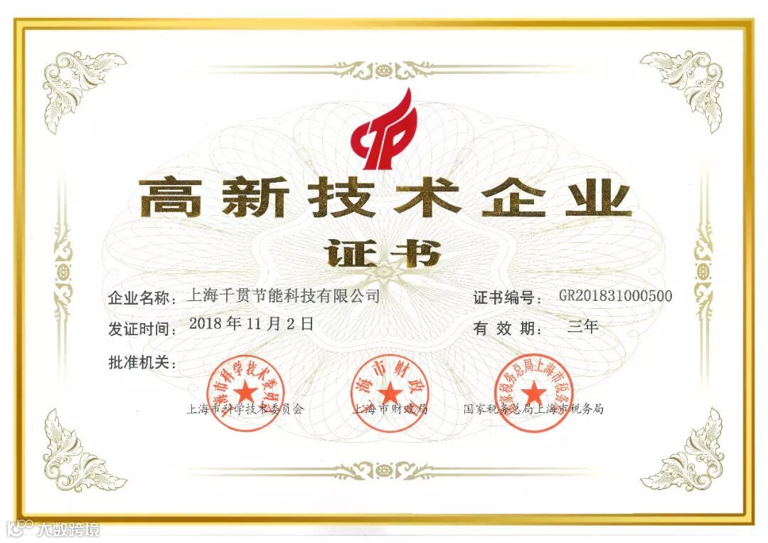 根据高新技术企业认定管理办法,经企业申报、专家评审、相关机构审核、公示等程序,上海千贯节能科技有限公司(简称:千贯)荣获由上海市科学技术委员会、上海市财政局、上海市国家税务局、上海市地方税务局联合颁发的“高新技术企业”证书(证书编号:GR201831000500 )。