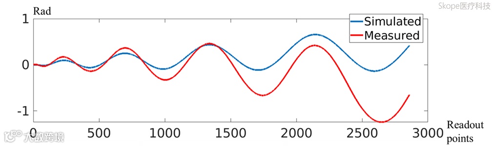 figure S5A: B0涡流电流(eddy current)导致仿真预测的相位误差(蓝色曲线)与Skope实测数据(红色曲线)存在显著差异
