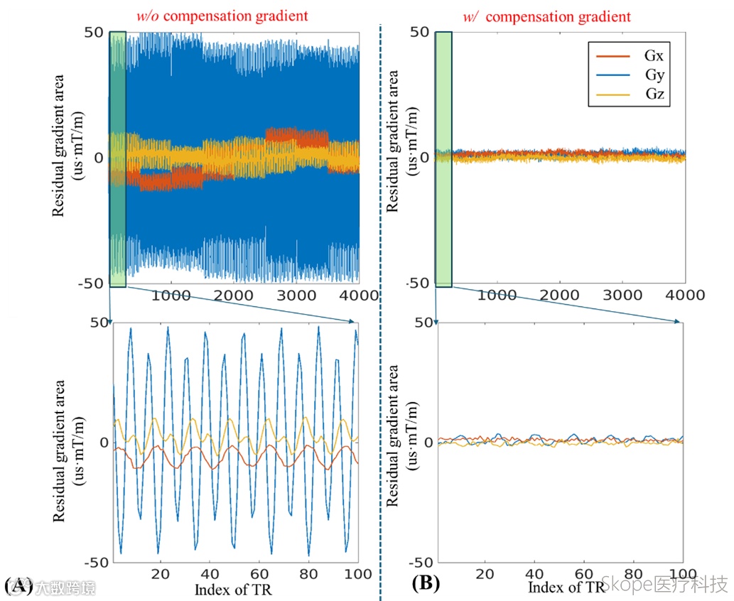 通过在每个TR中加入Skope实时场检测,并根据实际测量数据施加回绕补偿梯度,可将残余梯度面积从50 μs·mT/m降至<5 μs·mT/m,精度提升十倍以上。