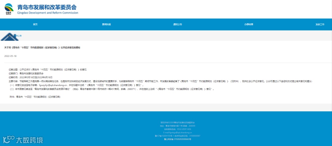 近日,青岛市发展和改革委员会印发关于对《青岛市“十四五”节约能源规划(征求意见稿)》公开征求意见的通知。