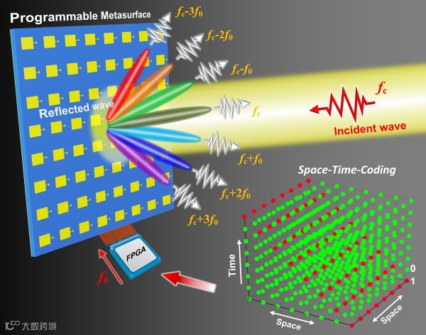 新型人工电磁材料,亦称电磁超材料(Metamaterials),是将具有特定几何形状的宏观基本单元周期/非周期性地排列,或者植入到基体材料体内(或表面)所构成的一种人工材料。电磁超材料和传统意义材料的区别在于用宏观尺寸单元代替了原来微观尺寸单元(原子或分子)。近些年来,为了减少体超材料的厚度及构造复杂性,单层平面结构的超表面(Metasurfaces)也广泛地用于调控电磁波。本发明提供了一种数字式可编程时空编码超材料,填补现有的空间编码超材料在时间维度上的空白,引入时间维度的调制,可以在空间域和频率域同时调控电磁波,提供了更大的自由度。通过设计时-空编码矩阵,时空编码超材料可以实现许多新奇的功能,例如谐波波束扫描,以及散射能量抑制等。