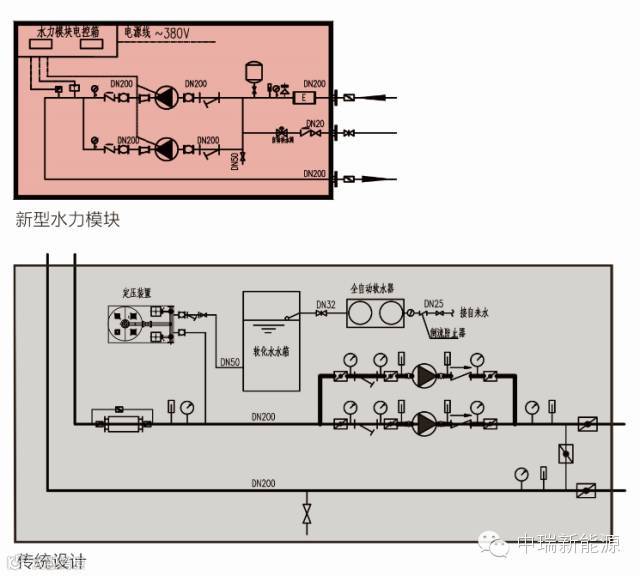 可与任何水循环中央空调机组配套使用,目前中瑞新能源的新型水力模块,单台配套流量从12m³/h~221m³/h,共20个型号,超出可多台并接供应。适用于地源热泵、空气源热泵、分体太阳能、燃气锅炉和常规清水、供水领域等暖通空调产品的配套应用。