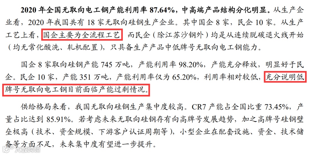 而中低牌号无取向电工钢,目前又面临产能过剩的问题。2020年,只具备中低牌号无取向电工钢生产能力的民企,产能利用率仅为65.20%;具有高牌号无取向电工钢生产能力的国企,产能利用率为98.20%。