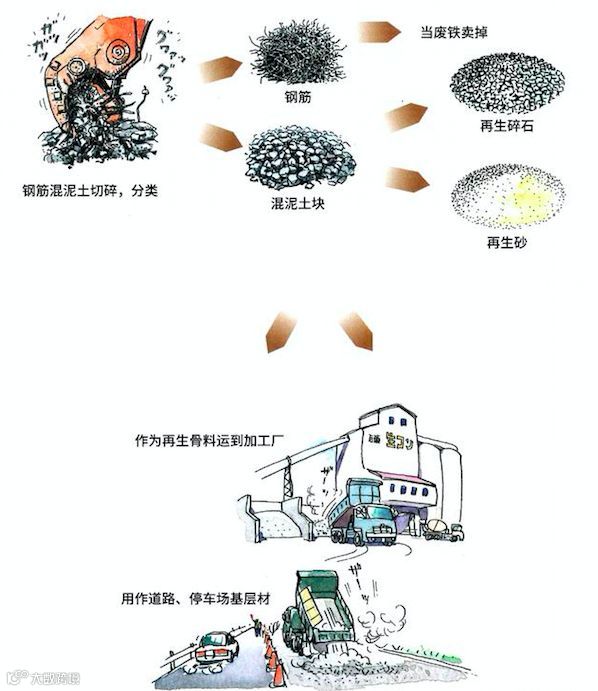 以钢筋混凝土碎块为例,其资源化回收再利用的流程如下,最终变成了用作道路和停车场等的基层建材。