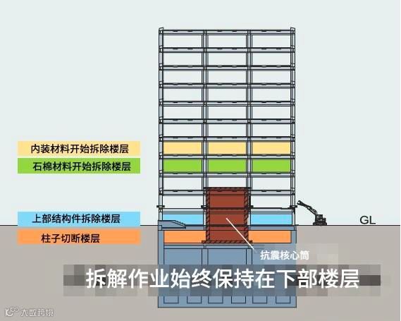 比如在拆这栋90米高的大楼时,鹿岛建设株式会社的工人同时把支撑大楼底部的40根柱子削短0.7米,并用液压千斤顶撑住大楼。
