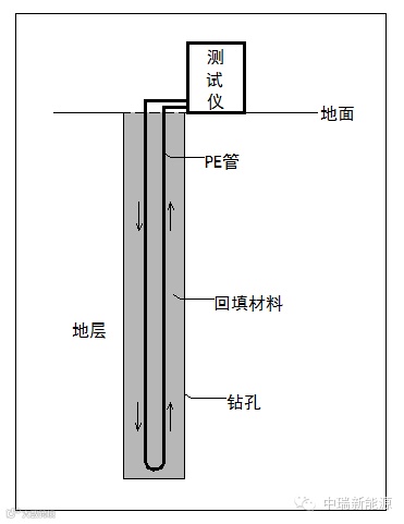 测试原理:按照简化后的线源传热模型,地热换热器与其周围岩土的换热方程可确定管内流体平均温度与深层岩土的初始温度之间的关系为: