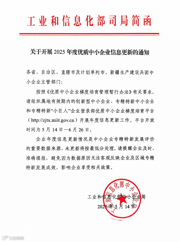 按照《优质中小企业梯度培育管理暂行办法》有关要求,请组织属地有效期内的创新型中小企业、专精特新中小企业和专精特新“小巨人”企业登录部优质中小企业梯度培育平台(http://zjtx.miit.gov.cn)开展年度信息更新工作。平台开放时间为5月14日-6月26日。