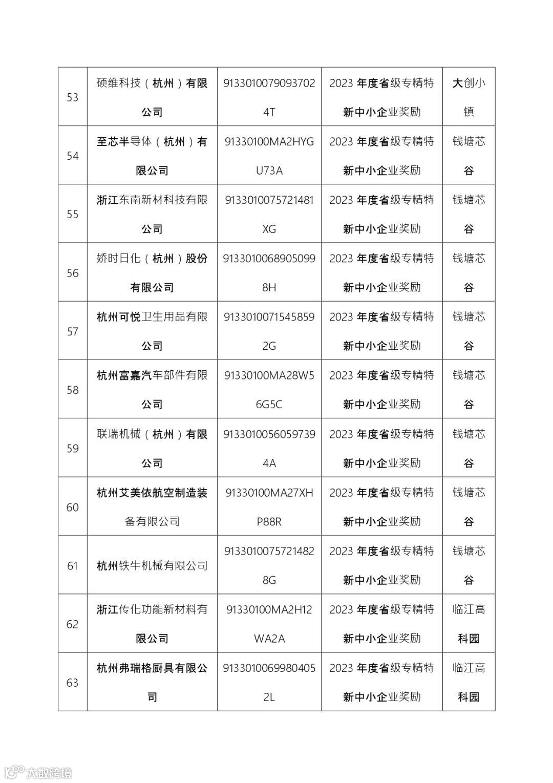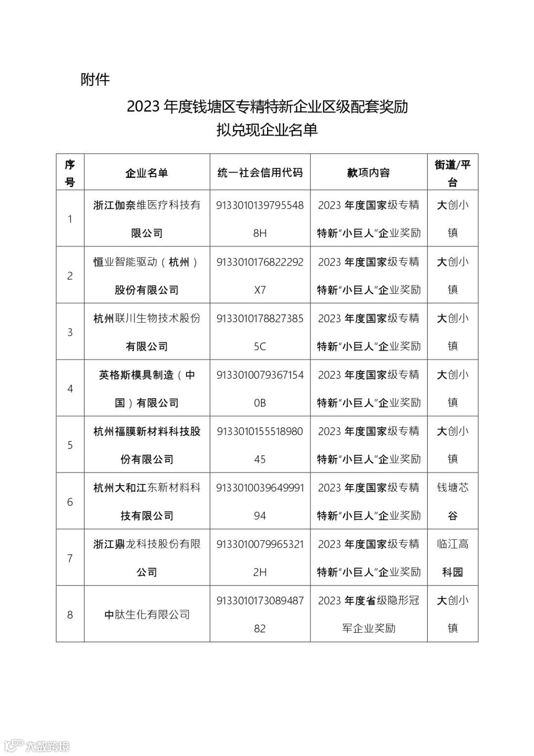 根据《杭州市人民政府办公厅关于打造全国专精特新名城的实施意见》(杭政办函[2023]81号)要求,经各部门联审,现将符合条件的2023年度钱塘区专精特新企业区级配套奖励拟兑现企业名单予以公示,名单以正式发文为准。公示期限为6月23日至6月27日,如有异议,请于6月27日前向区经信科技局反映,联系电话:89535467。
