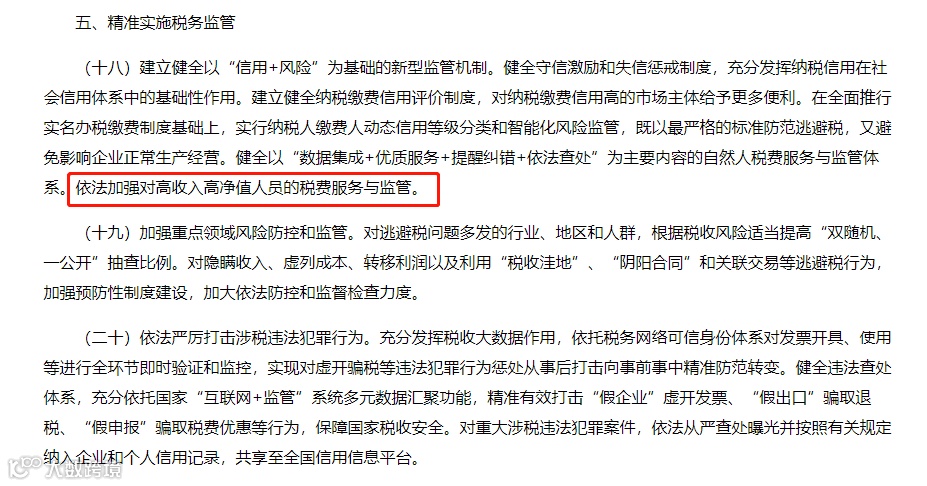另外,在《关于进一步深化税收征管改革的意见》这个文件中,更是直接明确:加强对高收入高净值人员的监督。