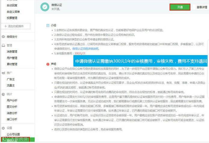 微信认证是引入专业的第三方审核机构对公众平台的主体资质进行审核,认证成功是获得平台各种高级服务(包括微信支付等)的前提。微信认证需费用300/次,认证通过后有效期限1年。