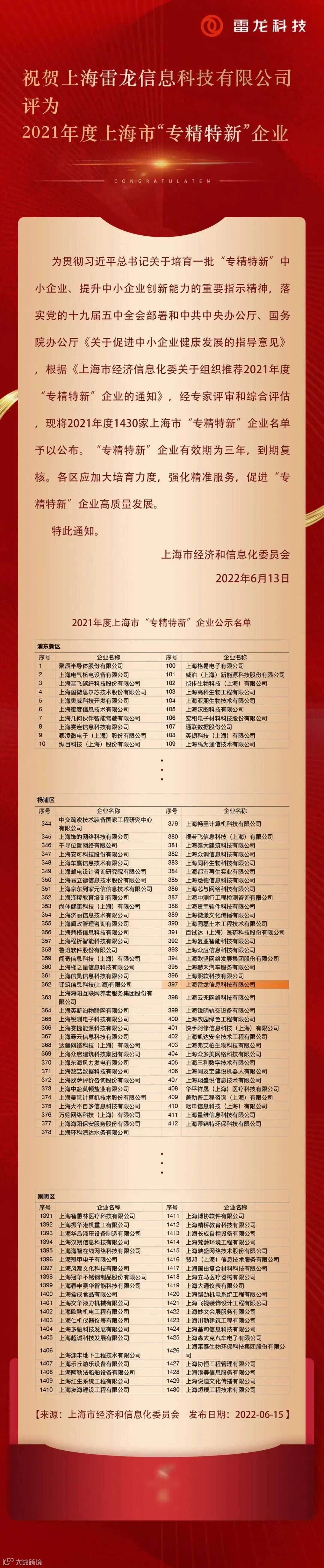 近日,银江资本投资企业雷龙科技荣获2021年度上海市“专精特新”企业称号。