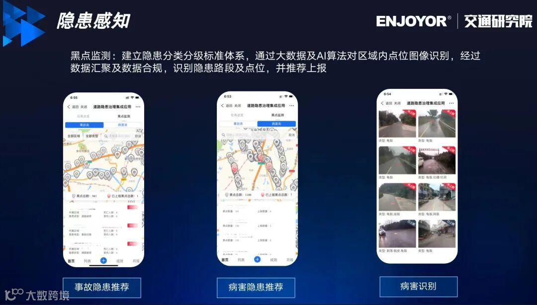 朱逸轩指出,要有效治理道路安全隐患,首要任务便是隐患感知。主要分为四个方面:首先,是对道路隐患进行自动感知和识别。主要在功能车、公交大巴、出租车等车辆上安装检测器,在车辆运行中实现实时的检测道路隐患;其次,通过交通管理人员定期对路况进行人工或视频等方式排查整治和信息录入;第三,黑点监测,建立隐患分类分级标准体系,通过大数据及AI算法对区域内点位图像识别,经过数据汇聚及数据合规,识别隐患路段及点位,并推荐上报;最后,主动上报是指市民可通过小程序进行上报,对于投诉建议进行研判分析管理。