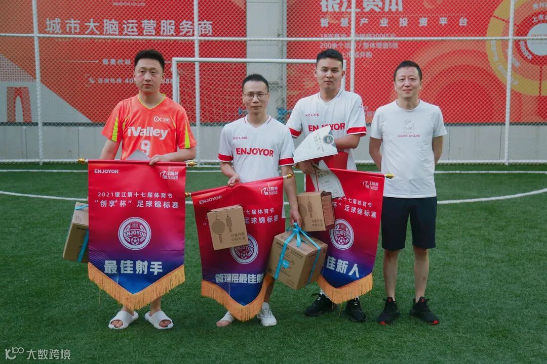 经过一天的激烈角逐,银江交通集团队成功捧得2021银江第十七届体育节“创享⁺杯”足球锦标赛冠军奖杯!创享⁺队、集团总部队分获亚军与季军。大赛同时评选出了最佳射手奖、最佳新人奖等多个奖项。