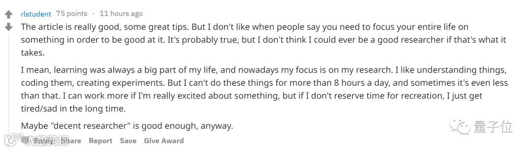 昵称为“rlstudent”的网友的评论引发了很多认同,他/她认为,研究只是生活中的一部分,不认同那种将生活所有精力都集中在一个事情上,才能取得成功的说法。