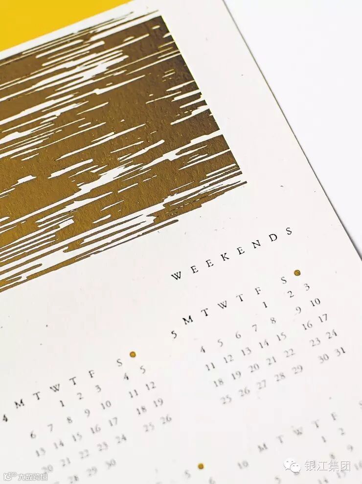 这张海报大小的日历,灵感来自美国加州的金色夕阳。每一张日历的角落都有手工印制凸版与浮雕艺术家印章。金箔的夕阳,丝网印刷的太阳与凸版印刷的日期,独特的风格与质感在印艺组合中得到了彰显。