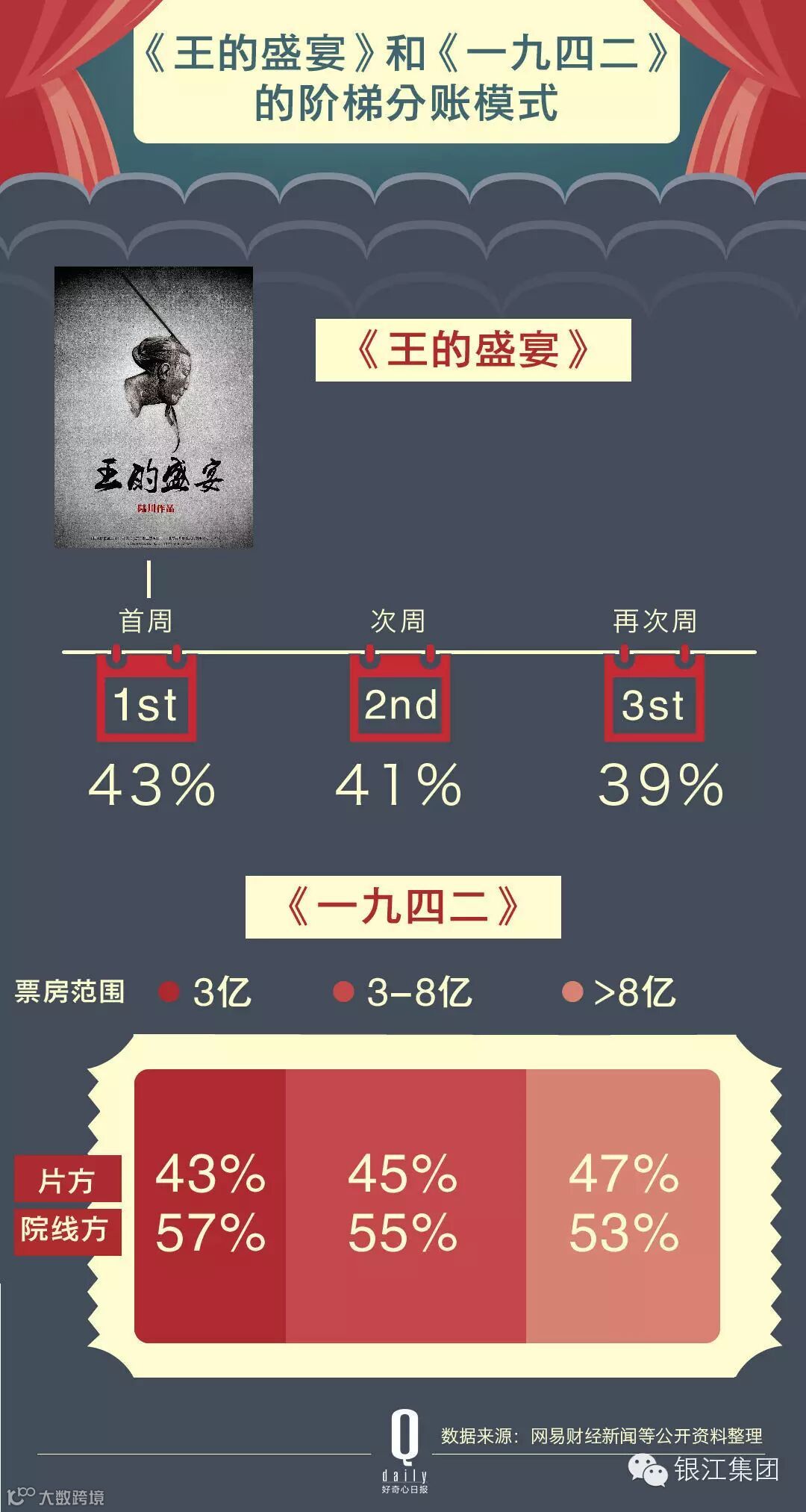 参考了好莱坞的分账模式,中国电影曾经在2012年贺岁档也试验过阶梯式分账模式。《王的盛宴》决定首周片方占43%,次周片方41%,再次周片方39%直至下片。