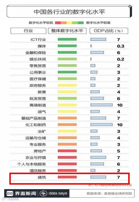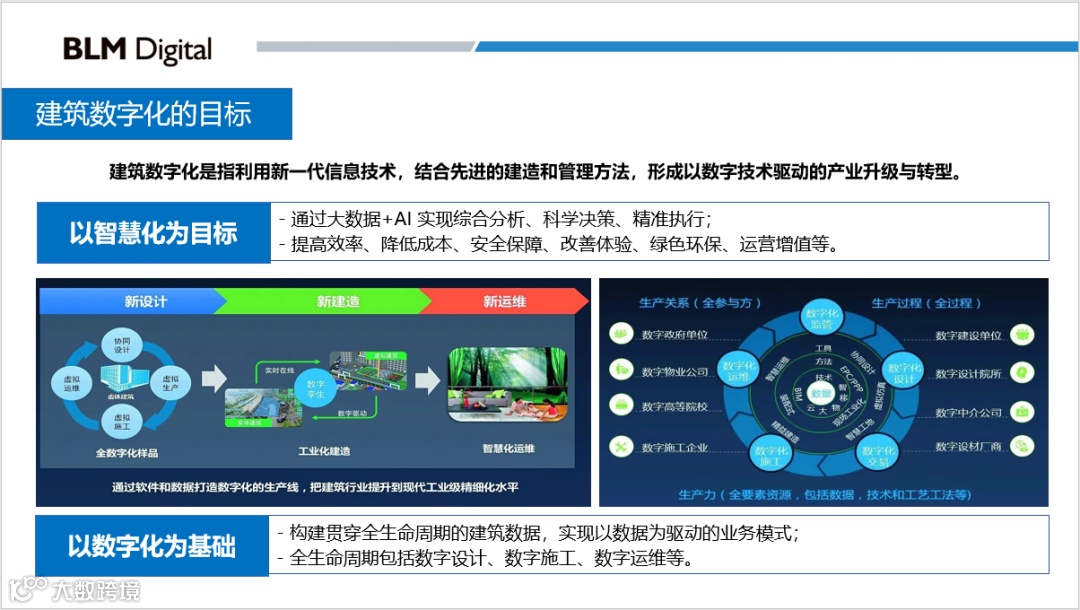 建筑数字化是指利用BIM、AI、大数据、物联网以及区块链等新一代信息技术,结合先进的建造和管理方法,实现以数字技术驱动的产业升级和转型。首先,构建贯穿建筑全生命周期、全要素、全参与方的建筑数据,实现数据利用性的管理模式。然后,通过大数据+AI技术,实现对建筑各阶段事件的综合分析、科学决策以及精准执行,从而提高建筑管理效率、降低建造运维成本、提升安全保障、改善住户体验,使建筑资产保值增值。所以说,建筑数字化转型是以数字化为基础,以智慧化为目标。