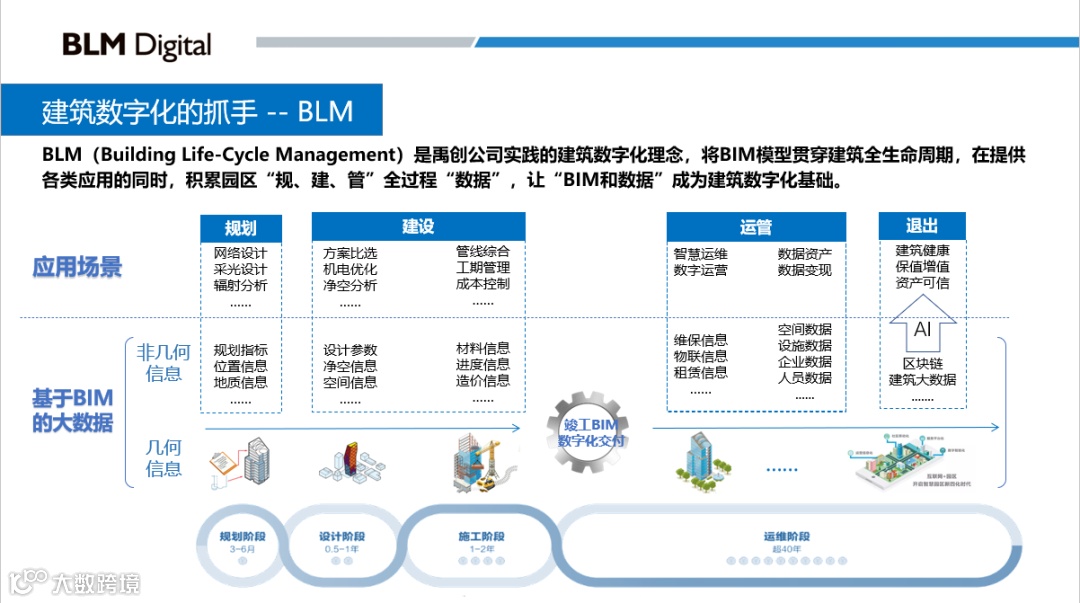 BLM是建筑全生命周期管理(Building Life-cycle Management)的简称,是禹创公司实践的建筑数字化理念,建筑全生命周期管理通常分为规划、设计、施工、运维几个阶段。