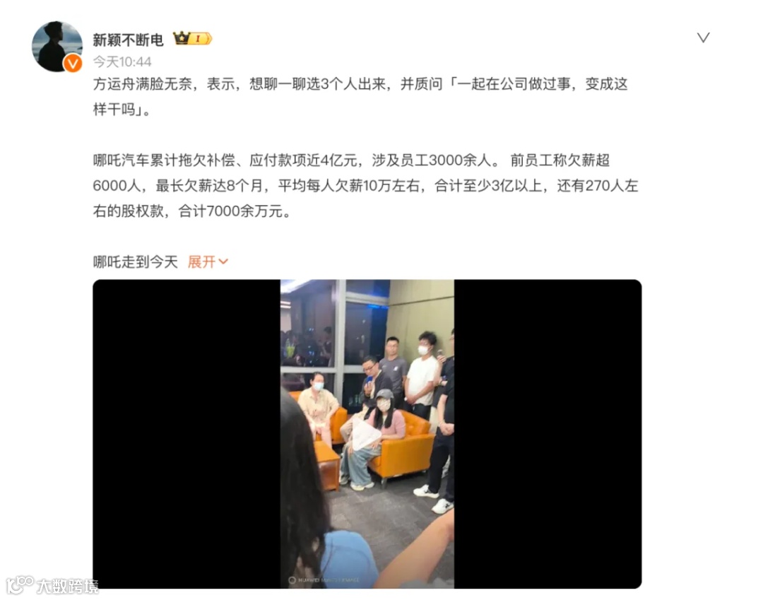 据中工汽车网获悉,6月12日,有知情人士爆料称,哪吒汽车上海总部内,不少员工围坐在董事长兼CEO方运舟的新办公室门口,讨要被拖欠的工资。现场气氛紧张,员工们情绪激动,方运舟则显得颇为不耐烦,直言“你们先选三个人出来。以前都在公司共过事,现在还这样干嘛。”