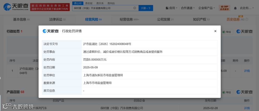 中工汽车网讯,5月20日,天眼查APP显示,保时捷(中国)汽车销售有限公司因通过虚假折价、减价或者价格比较等方式销售商品或者提供服务,被上海市浦东新区市场监督管理局罚款5万元,这一事件迅速引发舆论关注。