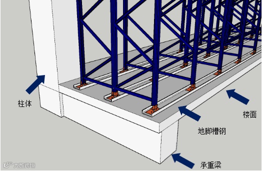 成品库位于三楼,属于楼层仓库。虽库房所在楼体的承载能力可以满足对货架的承载,但出于立体库安全和长期运行考虑,德力集团还是采取了加固措施,通过加大立柱地脚片的尺寸、在立柱地脚与楼面连接部分加装槽钢、利用10mm厚横斜撑加强立柱与楼体柱体的连接,最大限度地降低货架柱点对楼面的压强,确保项目的稳定与长久运营。