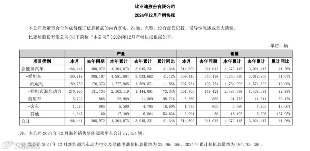 2024年全年,比亚迪累计销量达427.21万辆,同比增长41.26%,分别为中国汽车市场车企销量冠军、中国汽车市场品牌销量冠军、全球新能源车市场销量冠军。其中,纯电乘用车销售176.50万辆,插混乘用车销售248.54万辆;海外总销量约41.47万辆,同比大增71%,占公司全年销量的9.77%。