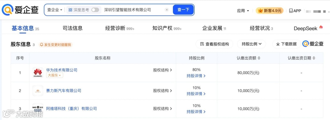 中工汽车网消息,4月29日,爱企查App显示,深圳引望智能技术有限公司因未依照规定期限公示年度报告,被深圳市市场监督管理局龙华监管局列入经营异常名录。在股权结构上,华为持股比例高达80%,是该公司的绝对控股股东,阿维塔科技(重庆)有限公司与赛力斯汽车有限公司则分别持有10%的股份。