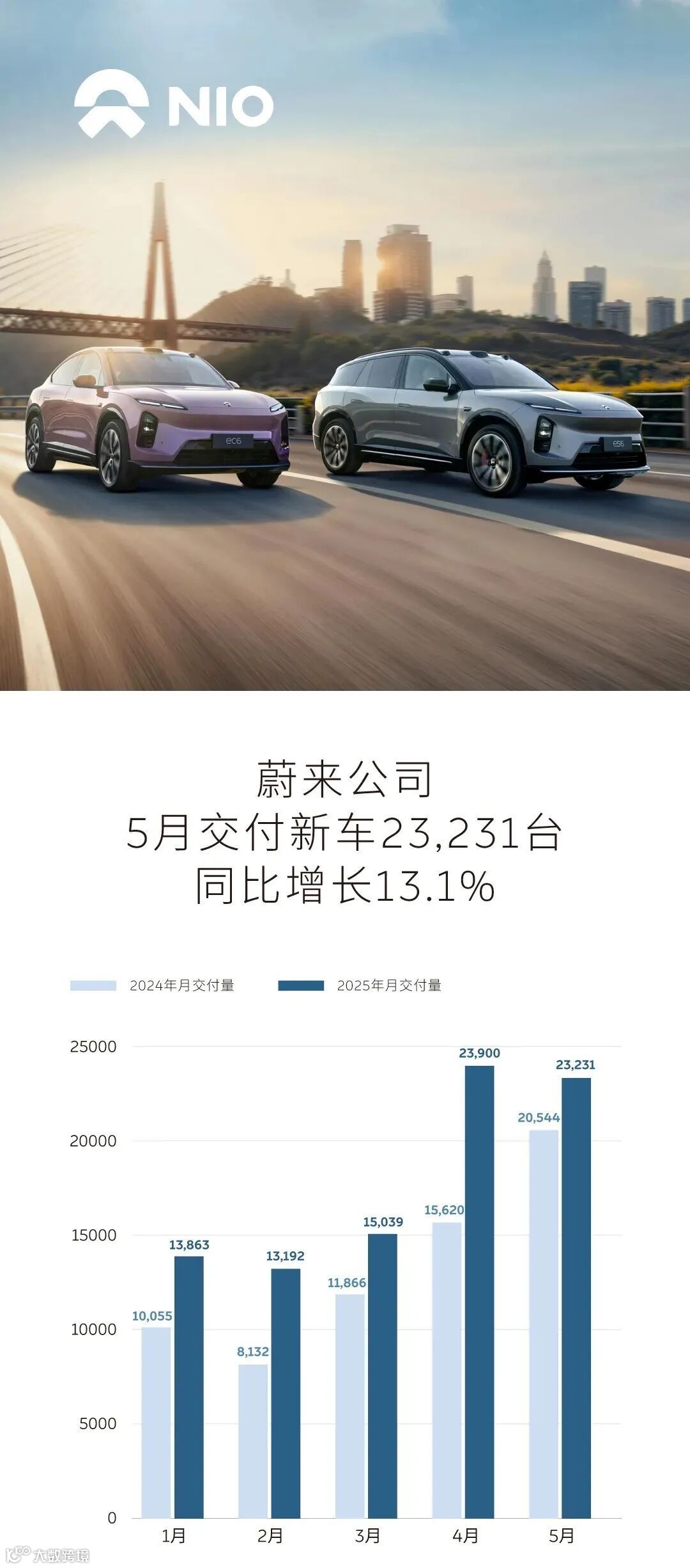 2025年5月,蔚来交付新车23231辆,同比增长13.1%,环比微降3%。其中,蔚来品牌交付13270辆、乐道品牌交付6281辆、萤火虫品牌在其首个完整交付月交付新车3680辆;截至2025年5月31日,蔚来公司已累计交付新车760789辆。其中,蔚来品牌交付710655辆、乐道品牌交付46223辆、萤火虫品牌交付3911辆。