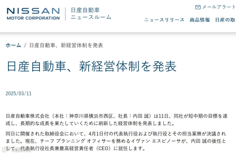 中工汽车网讯,3月11日,日产汽车宣布,在当天的董事会会议上,决定现任社长内田诚将于3月底卸任,其职位将由公司首席规划官伊万·埃斯皮诺萨接任,该任命自4月1日起正式生效。这一消息结束了数周以来有关谁将接替内田诚、执掌这家陷入困境的日本汽车制造商的猜测。