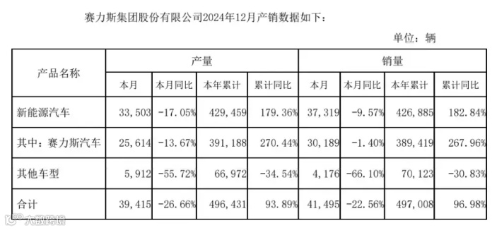 2024年全年,赛力斯集团累计销量为49.7万辆,同比增长96.98%。其中,新能源汽车销量为42.69万辆,同比增长182.84%。问界新M7和问界M9的市场表现尤为突出。问界新M7在2024年度累计交付量突破19万辆,连续12个月蝉联中国新势力车型销量第一;问界M9上市12个月累计大定超20万辆,打破了国外品牌在中国豪车市场的垄断,持续刷新中国新能源汽车品牌新纪录。