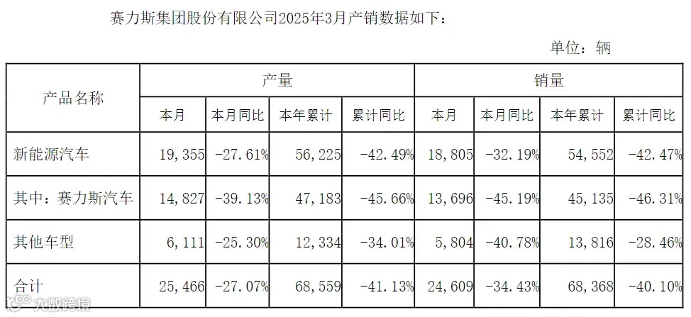 2025年第一季度,赛力斯集团累计销量为6.84万辆,同比下降40.1%。其中,新能源汽车销量为5.46万辆,同比下降42.47%。进入今年开年以来,赛力斯的销量就在持续的下跌,这与国内新能源车企竞争激烈、价格战打响有一定的关系。