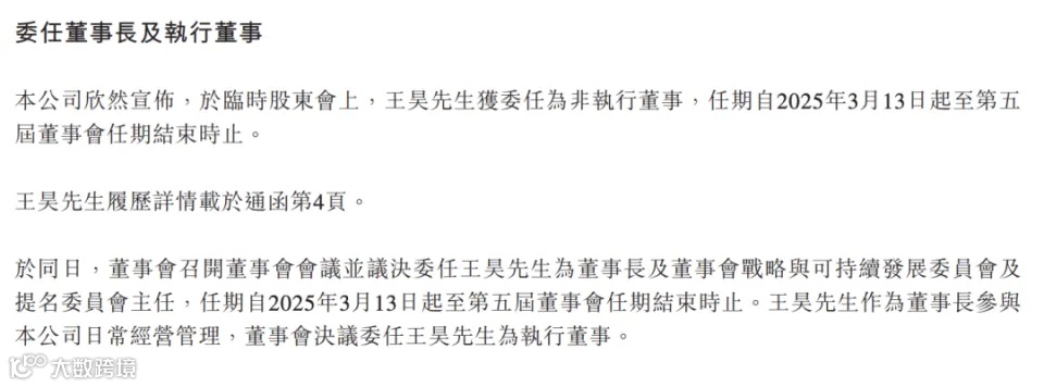 中工汽车网消息,3月14日,北京汽车股份有限公司发布公告,宣布2025年第一次临时股东会投票结果及委任董事长及执行董事。董事会决议委任王昊先生为董事长及董事会战略与可持续发展委员会及提名委员会主任,任期自2025年3月13日起至第五届董事会任期结束时止。王昊先生作为董事长参与本公司日常经营管理,董事会决议委任王昊先生为执行董事。