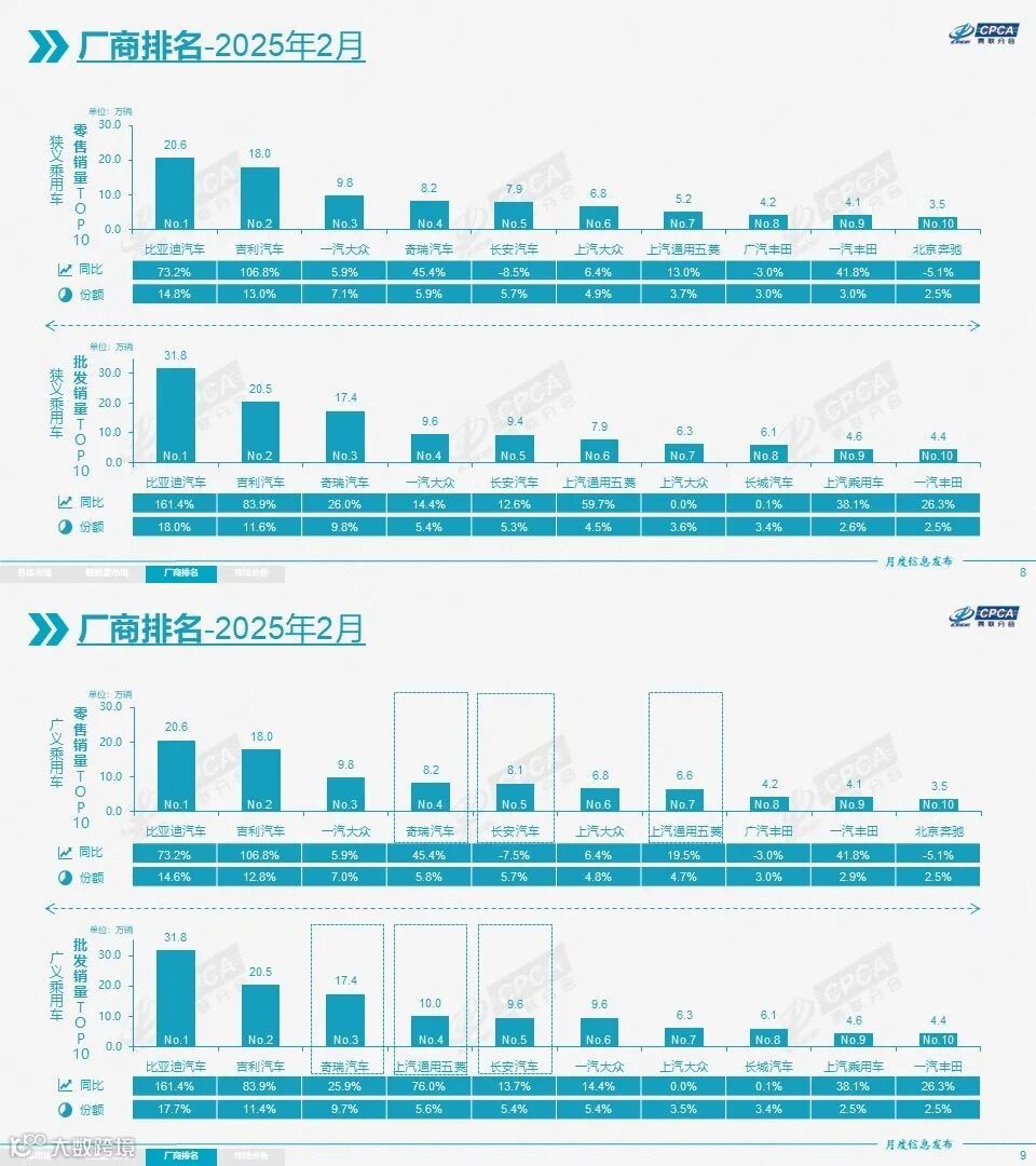2025年2月,以比亚迪汽车、吉利汽车、奇瑞汽车等为代表的狭义插混表现持续较强;一汽丰田、广汽丰田、长安福特、东风本田、东风日产等混合动力的自主品牌销量逐步提升;长安汽车、上汽通用五菱等车企国内新能源零售很好。