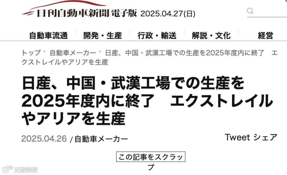 4月28日消息,近日,据多家日媒报道,日产汽车位于中国武汉的工厂将于本年度(截至2026年3月的2025财年)结束生产活动。该工厂主要生产日产艾睿雅纯电动汽车和日产奇骏SUV,年产能为30万辆。