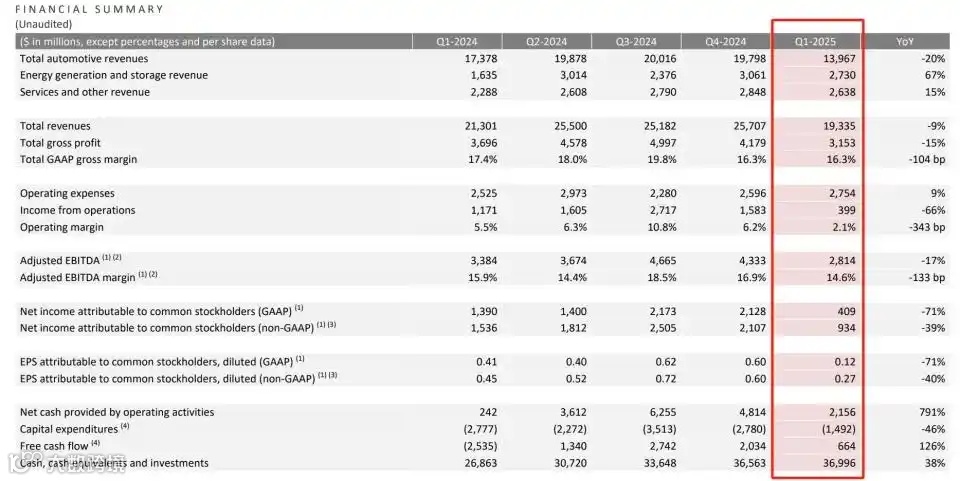 2025年第一季度,特斯拉营收193.35亿美元、同比下降9%,此前市场预估为213.48亿美元;同期实现净利润为4.09亿美元,同比下降71%,此前市场预估11.32亿美元;调整后每股收益0.27美元,较上年同期下降40%。