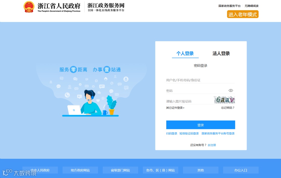 二、输入政务服务网账号密码后,点击“登录”按钮登录(如政务网未注册用户,请先在浙江省政务网注册),系统自动跳转至申报首页。